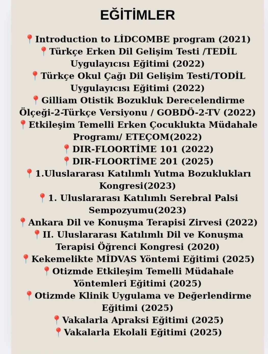 Mesleki olarak çeşitli kurs , seminer , kongre ve eğitimlere katılarak kendimi geliştirdim ve hala da gelişmeye devam ediyorum. Mesleki olarak deneyimliyim. Online ve yüz yüze terapiler yapmaktayım. Dil, konuşma, ses ve yutma bozukluklarıyla çalışmaktayım.