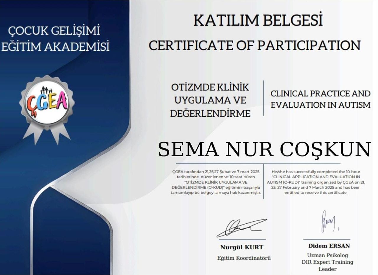 Semanur hocamızla rehabilitasyon merkezinde tanıştık. Oğlum özel bir çocuk; otizm tanısı konuldu. Semanur hocamızla birkaç aydır eğitim almaya başladık. Kendisi mesleğini hakkıyla yerine getiren kıymetli hocamızdır. Eğitimi, oğluma yaklaşımı verdiği destek, oğlumun üzerinde faydası oldu. Böylesine değerli hocamızı tavsiye ederiz.