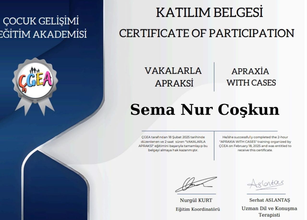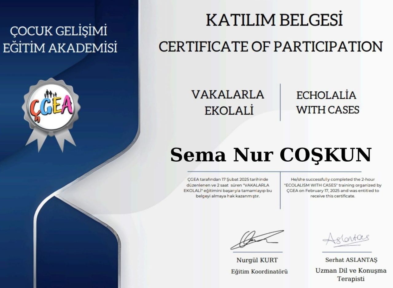 Merhaba ben Dil ve Konuşma Terapisti Sema Nur Coşkun. 2023 yılında Hacettepe Üniversitesi Dil ve Konuşma Terapisi bölümünden onur öğrencisi olarak mezun oldum. Eğitim hayatım boyunca Hacettepe Üniversitesi Hastanelerinde, Özel Kliniklerde , Özel eğitim ve rehabilitasyon merkezlerinde, Ankara Bilkent Şehir hastanesinde staj ve gözlemler yaptım.